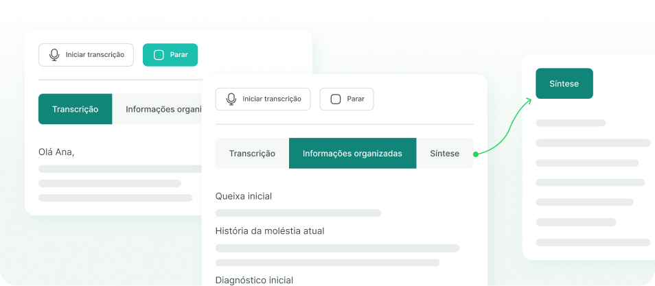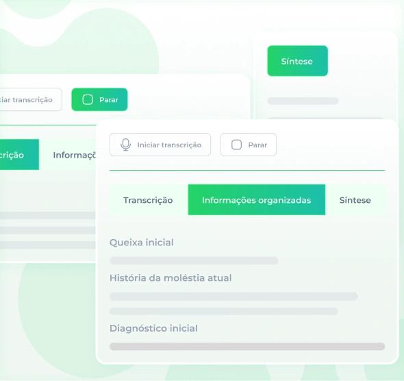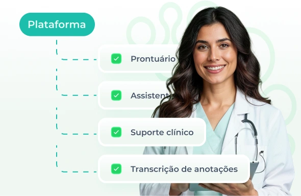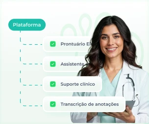 A plataforma se adapta à área de atuação de cada profissional, oferecendo prontuário eletrônico configurável, assistente de IA para suporte clínico e transcrição de anotações.