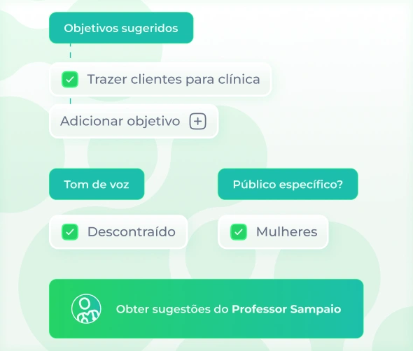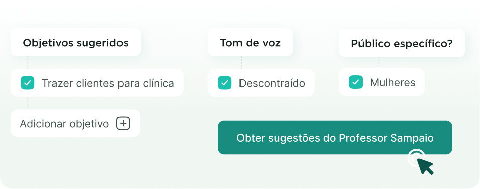 Com o Professor Sampaio, nossa IA, você cria campanhas de forma simples e rápida. Defina o objetivo, o tom e o público, e receba opções de texto prontas para escolher. Crie campanhas segmentadas por perfil, histórico, necessidade, idade e muito mais.
